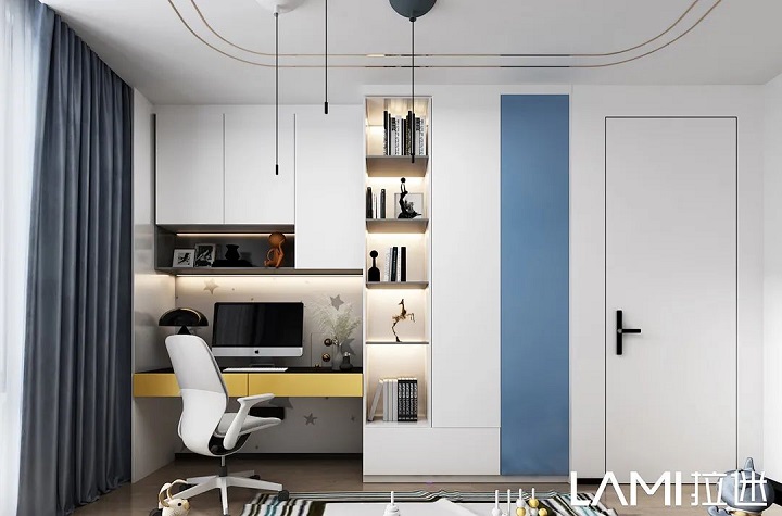拉迷一直致力于兒童房空間定制的設計研發(fā),兒童房與其它空間有所不同的是,它對色彩、燈光、布局和板材等諸多細節(jié)有挑剔的要求,而且從小學開始,小朋友的寫字桌永遠堆滿了東西——儲物和學習空間混在一起,小朋友還經常理直氣壯弄不明白——既然明天還要用,今天為什么還要收起來?