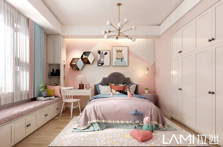 兒童房色彩搭配,拉迷一般采用幾款最接近大自然的板材:佩羅柏木、布格拉灰、伊麗莎白、絨面水藍等,色彩明亮、自然,對孩子的視力可以起到舒緩、放松。