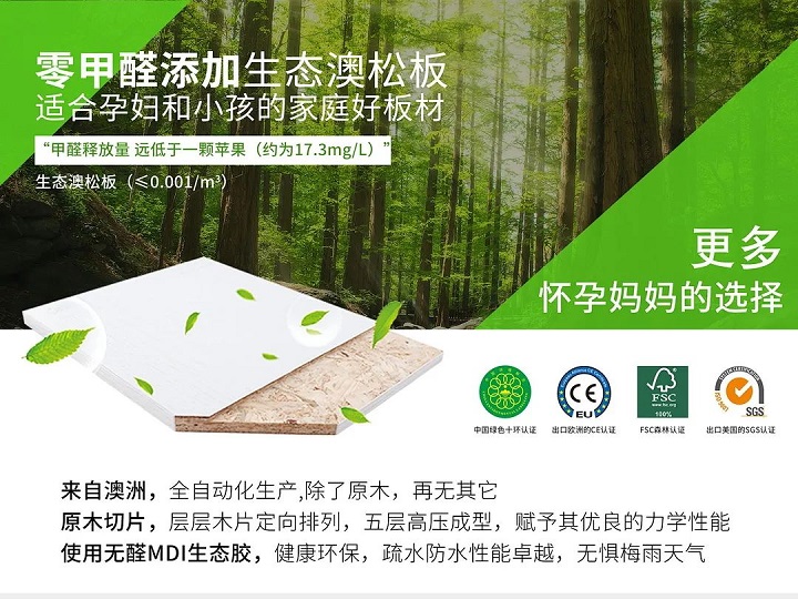 澳松板環(huán)保等級(jí)非常高,是唯一一個(gè)通過(guò)了澳大利亞、新西蘭和日本三國(guó)聯(lián)合認(rèn)證的板材。它是將新鮮的澳洲松木打成纖維,七天內(nèi)完成所有工藝制成成板,否則的話木質(zhì)纖維會(huì)產(chǎn)生藍(lán)變反應(yīng),整個(gè)變藍(lán)。所以說(shuō)他的成品制作周期非常的短,要求同時(shí)也很高,最新鮮的木材保證了他的環(huán)保等級(jí)更健康、更安全,大人孩子安心入眠。